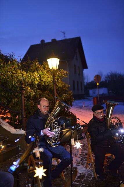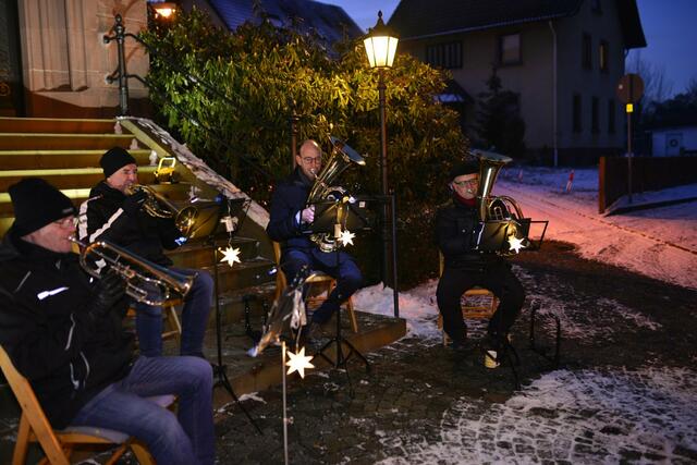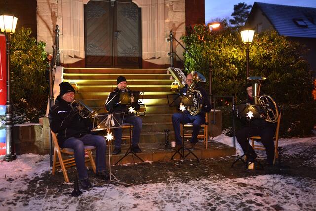Im stimmungsvollen Ambiente vor der Kirche lauschten die zahlreichen Besucherinnen und Besucher den weihnachtlichen Liedern der Blechbläser. Die Musiker Wolfgang und Leo Zöller (beide Flügelhorn) sowie die SPD-Stadträte Michael Wöber und Benjamin Bohlender (Tenorhorn und Bariton) ließen viele bekannte Weisen erklingen.