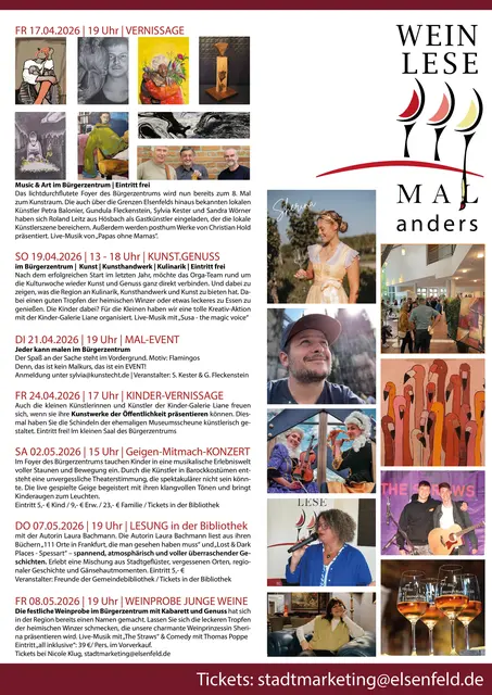 Im Bürgerzentrum wird an diesem Sonntag gezeigt, was die Region an Kulinarik, Kunsthandwerk und Kunst zu bieten hat. Und dabei einen guten Tropfen der heimischen Winzer oder etwas leckeres zu Essen zu genießen. Für die Kleinen gibt es eine tolle Kreativ-Aktion mit der Kinder-Galerie Liane. Live Musik mit "Susa - the magic voice".