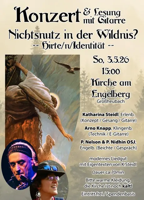 Am Sonntag, den 3. Mai 2026 findet ab 15:00 Uhr unter der Leitung von Katharina Steidl ein Konzert & Lesung mit Gitarre in der Wallfahrts- und Klosterkirche statt. Die Oblatenpatres laden alle Engelbergfreunde ganz herzlich ein, zusammen mit Ihnen eine besondere Veranstaltung nach dem Motto „Nichtsnutz in der Wildnis“, in der spirituellen Umgebung der Kirche zu genießen. Katharina Steidl, Erlenbach wird Sie zusammen mit Arno Knapp, Klingenberg in einer einzigartigen Atmosphäre mit modernem...