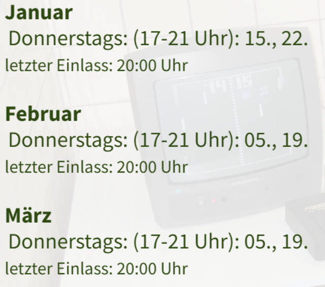 Das Yesterchips Museum hat an folgenden Donnerstagabenden, immer von 17-21 Uhr, für Euch geöffnet: 15.01., 22.01., 05.02., 19.02., 05.03., 19.03.