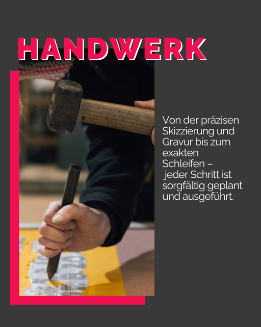 Dabei ist Exaktheit für uns kein Selbstzweck. Sie ist das Fundament für Ausdruck und Wirkung. Denn nur wenn die Proportionen stimmen, wenn die Gravur genau sitzt, wenn jede Kante sauber gearbeitet ist, entsteht etwas, das Bestand hat - handwerklich und emotional.