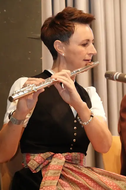 - Solistin Dörthe Braun faszinierte an der Querflöte mit dem Stück „Dornenvögel“ und erhielt reichlich Applaus vom Publikum und einen symbolischen Handkuss vom Dirigenten.