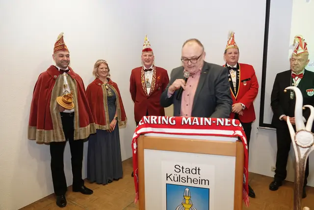 Bürgermeister Thomas Schreglmann begrüßte die Gäste als Schirmherr. Das Külsheimer Stadtoberhaupt betonte die Bedeutung der Fasnacht für das gesellschaftliche Miteinander und präsentierte die Stadtgeschenke – Freigetränke, verstanden als Zeichen der Wertschätzung. Ein kurzer gereimter Einschub lockerte seine Ansprache auf und sorgte für zustimmende Reaktionen.