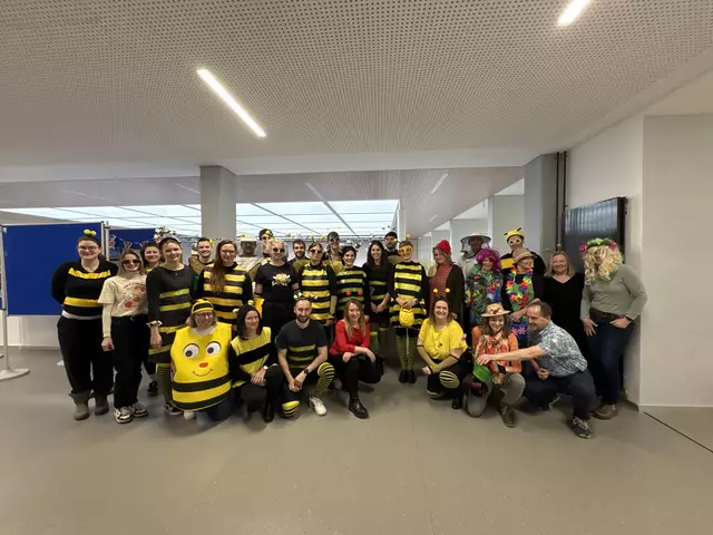 „Hallenfußballzauber, Cheerleading und Verkleidungsparty als besondere Miltenberger Faschingskombi“, umschrieb Schulleiter Ansgar Stich schmunzelnd die schon traditionellen bunten Aktivitäten des Johannes-Butzbach-Gymnasiums am letzten Schultag vor den Faschingsferien. Das Schulhaus füllte sich an diesem Tag mit allerhand verkleideten Gestalten, nicht nur Schülerinnen und Schüler trugen mit ihren kreativen Kostümen zum närrischen Treiben bei, auch die meisten Lehrkräfte erschienen dem Anlass entsprechend: Das intern ausgegebene Motto des Kollegiums „Bienen und Blumen“ wurde sehr spaßig umgesetzt. Die verlängerte erste Pause wurde mit dröhnenden Beats zur Faschingsparty, während der die Schülerinnen und Schüler der K12 einen reichhaltigen Pausenverkauf durchführten. Die traditionelle Kostümprämierung durch die SMV stellte für viele einen Höhepunkt des Tages dar: Zunächst wurden Fotos von den Kandidatinnen und Kandidaten gemacht. Anschließend entschied die SMV-Jury und zeichnete die Gewinnerinnen und Gewinner in den Spielpausen des Fußballturniers in der benachbarten Realschulturnhalle aus. Beim diesjährigen Fußballturnier gab es mit dem Team Q12 einen würdigen Sieger in einem zwar durchaus ehrgeizig geführten, aber von großer Fairness geprägten Turnier. Platz 2 eroberte die K12 und verwies damit das Lehrkräfteteam rund um die Kapitäne Janek Schiller und Christina Blanz auf den 3. Platz. „Toll war z. B. bei allem Siegeswillen, dass auch die schwächeren Teammitglieder integriert wurden, so dass durchgängiger fliegender Wechsel stattfand“, freute sich der mitspielende Schulleiter Stich. Aber nicht nur Kostümprämierung und Ballsport standen im Mittelpunkt: Eine mitreißende, professionelle und mit tosendem Beifall bedachte Choreographie lieferte die Cheerleader-Formation der 12. Jahrgangsstufe, die sich extra zu diesem Zweck gegründet hatte. Schulleiter Ansgar Stich resümierte den tollen, lustigen und gemeinschaftlichen Tag der gesamten Schulgemeinschaft des JBG: "Nicht nur, aber ganz besonders an so einem Tag sind wir Schule mit Herz und Freude!"