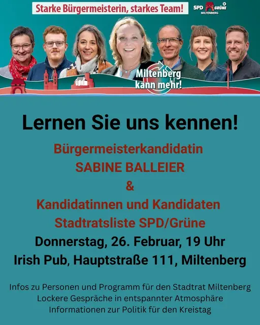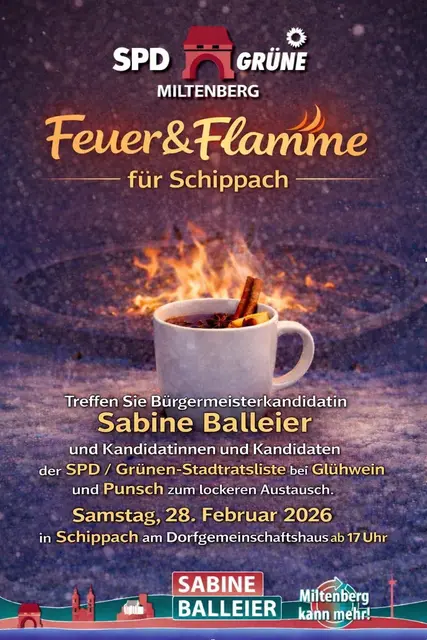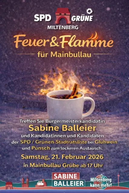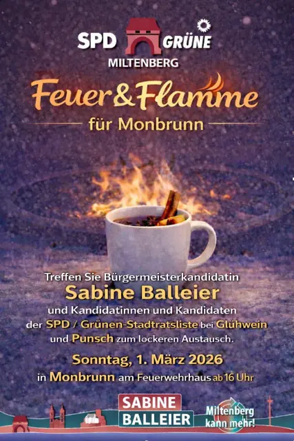 Unter dem Motto „Feuer & Flamme für Monbrunn“ kommen Bürgermeisterkandidatin Sabine Balleier und Kandidierende der SPD/Grünen-Liste für den Miltenberger Stadtrat am Sonntag, 1. März, nach Monbrunn. Von 16 bis 18 Uhr gibt es am Feuerwehrhaus Glühwein, Punsch und gute Gespräche. In entspannter Atmosphäre besteht die Möglichkeit, die Bürgermeister-Kandidatin und Kandidierende auf der Liste kennenzulernen und sich auszutauschen.