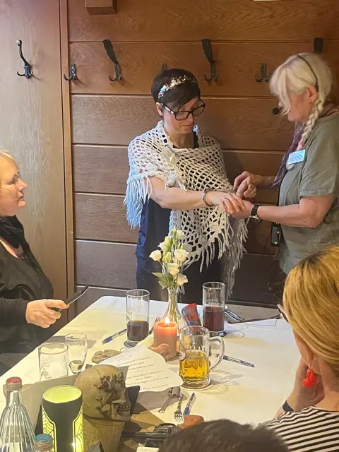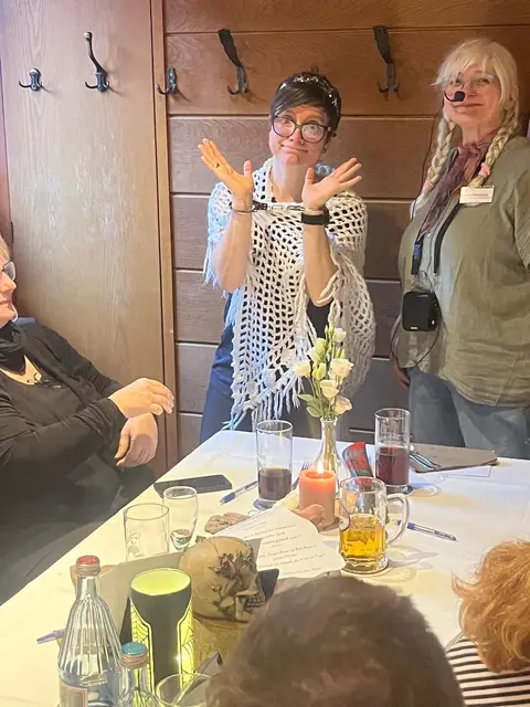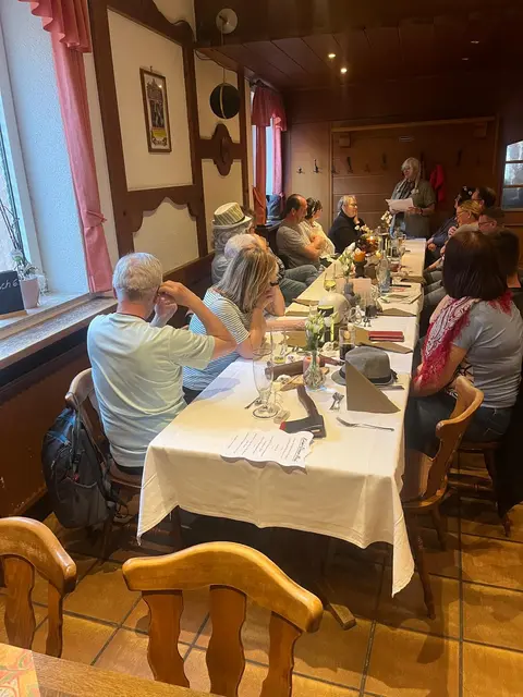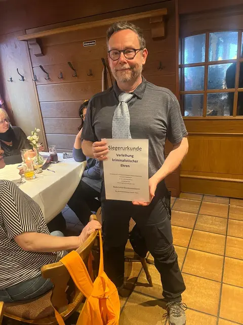 Übers Wetter konnten wir uns wirklich nicht beklagen, bei unserer 11. Geologisch-kriminellen Schlemmerwanderung und so marschierten wir fröhlich und gut gelaunt los, vom Mömlinger Wanderheim, der Eichwaldhütte, in den Wald. Schnell waren wir an der Grube Berta, die die alten Mimlinger noch unter dem Namen „Eisegruwe“ kennen, angelangt. Über die Grube und die typischen landschaftlichen Veränderungen, die in der Umgebung von Bergwerken vorkommen, gab es manches zu erzählen und anzuschauen. Unser Geologe Leon wusste viel Interessantes darüber zu berichten und hatte auf fast jede Frage eine Antwort – nur der Name der Grube, nämlich Berta - blieb nach wie vor ein Rätsel. Möglicherweise war es doch eine Kuh, wie in Didi Hallervordens Sketch über die Kuh Berta (Birgids Vermutung), oder eine Geliebte des Besitzers, mutmaßte Leon. Danach ließ Krimiautorin Birgid, die Teilnehmer auf humorvolle Weise, tief in die Abgründe einer menschlichen Seele blicken. Jahrelang aufgestaute Wut entlud sich durch einen plötzlichen Gefühlsausbruch. Es ist nicht gut, Gefühle in sich hineinzufressen, wie wir wieder feststellen konnten und der alte Spruch: „Drum prüfe, wer sich ewig bindet, ob sich nicht doch was Besseres findet!“, hat immer noch seine Berechtigung. So sorgte die freiwillige Witwe dafür, dass wir etwas zu tun hatten und gespannt die Indizien suchen konnten, die zahlreich im abgesperrten Tatortbereich zu finden waren. Nach einer angenehmen Wanderung, mit interessanten Informationen unterwegs, langten wir schließlich wieder an der Eichwaldhütte an und fuhren gemeinsam ins Ort zurück. Bis zur Wolfsschänke gab es noch einiges zu finden und wir witzelten, ob einer der Hinweise möglicherweise auf dem Kirchturm liegen könnte. Schließlich stand praktischerweise noch ein Gerüst drumherum. Von einer Durchsuchung sahen wir jedoch aus Sicherheitsgründen ab und marschierten in die Wolfsschänke, wo wir unsere Fundstücke auspackten. Die Verdächtigen fanden sich schnell und wurden für die Ermittlungspinnwand von unserem Tatortfotografen Werner abgelichtet. Das opulente Dinner, zubereitet von unserem Koch Michael, bestens bewandert in tödlichen Nahrungs- und Würzgiften, begann. Nach köstlicher Suppe und zwischen Salatteller und sehr schmackhafter Hauptmahlzeit, kreiste Kommissarin Magda, alias Birgid, die Verdächtigen immer mehr ein, so dass wir bereits vor dem exquisiten Nachtisch, den Mörder, bzw. die Mörderin, verhaften konnten. Mit der leckeren, für Auge und Magen gleichermaßen herrlichen Nachspeise, beschlossen wir unser Event, indem wir dem Gewinner die Urkunde und den neuesten Mümlingtalkrimi von Birgid, überreichten. Alle Teilnehmer haben so gut mitgemacht, waren ausgelassener Stimmung und fröhlich, dass wir ehrlich und vollen Herzens sagen können: „Es war uns auch diesmal wieder ein Vergnügen!“