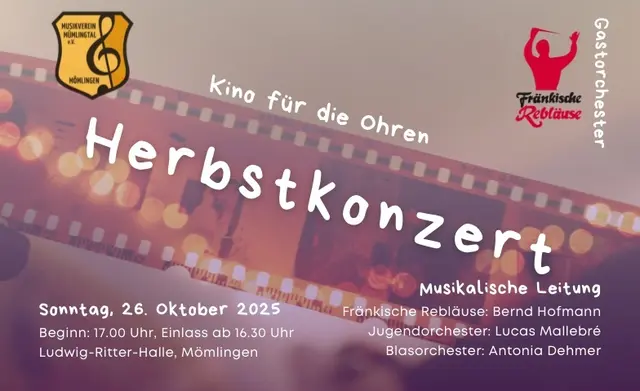 Kino für die Ohren – mit dem Blasorchester und Jugendorchester des Musikvereins Mümlingtal und den Fränkischen Rebläusen Bürgstadt. Hören Sie die Musik bekannter Film–Klassiker in der Mömlinger Ludwig–Ritter–Halle. Das Herbstkonzert am Sonntag, den 26.10.2025 beginnt um 17.00 Uhr, Einlass ab 16.30 Uhr. Karten sind an der Abendkasse (15 €) oder im Vorverkauf (12 €) erhältlich bei Gerner Musikinstrumente in Mömlingen, Frank Wöber (06022/38626 / fwoeber@t-online.de), bei allen Musiker:innen oder...