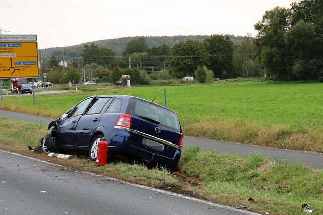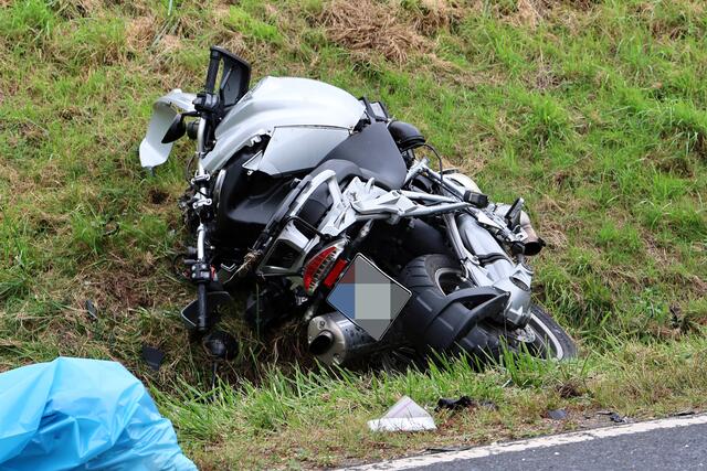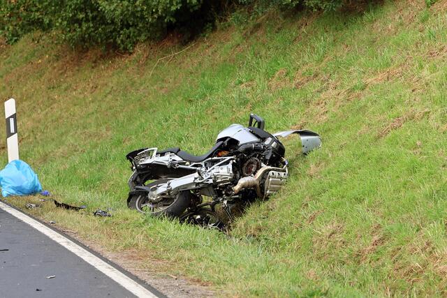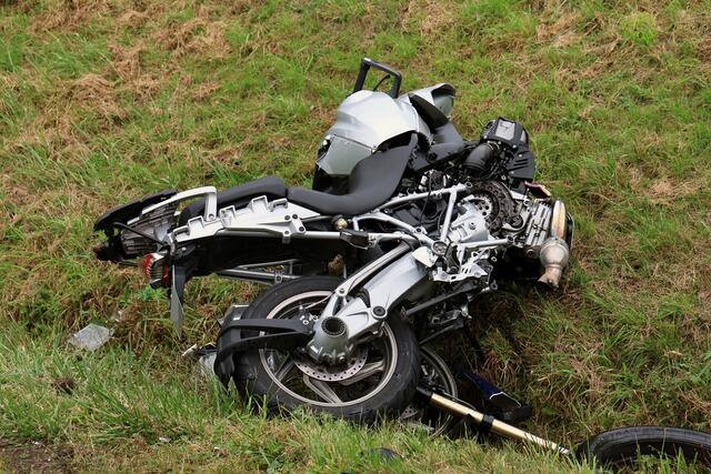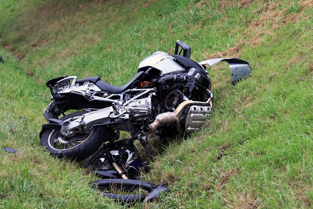 Das Motorrad prallte in den PKW und landete anschließend abseits der Fahrbahn an einer Böschung. Die 36-jährige Opelfahrerin kam nach dem Zusammenstoß nach rechts von der Fahrbahn ab und in einem Straßengraben zum Stehen.