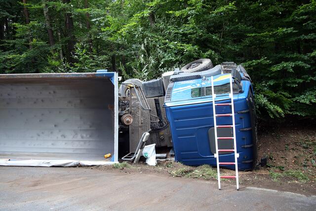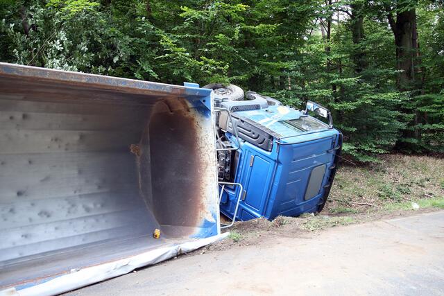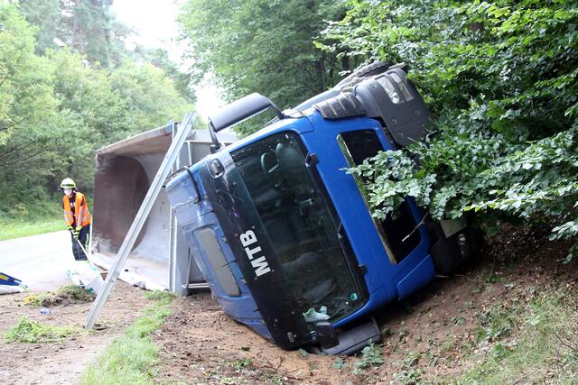 Kurz vor 9.30 Uhr war ein von Stockstadt kommender Sattelzug nach links von der Fahrbahn abgekommen, in die Böschung geprallt und auf die Seite umgekippt.
