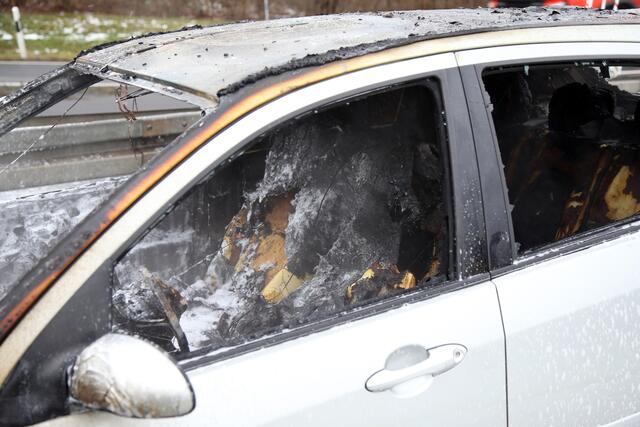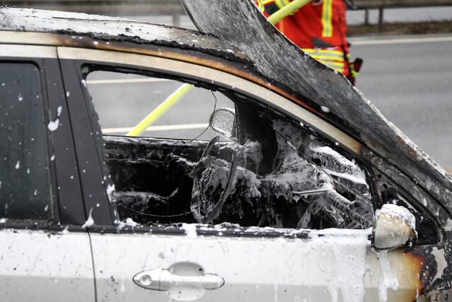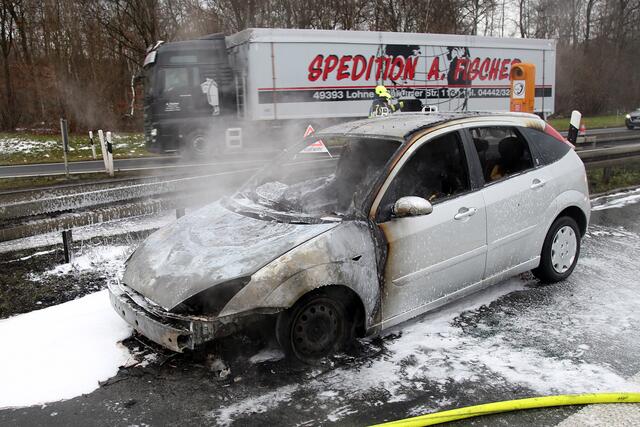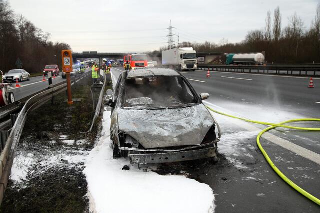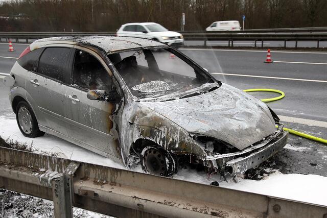 Kurz nach 9 Uhr hielt ein Fordfahrer sein Auto wegen Motorproblemen auf dem Standstreifen der Autobahn an. Hier stellte er Flammen im Motorraum fest, welche auch schnell auf den Innenraum übergriffen. Der Fahrer und ein Mitfahrer konnten sich noch in Sicherheit bringen, bevor der Ford lichterloh in Flammen stand.