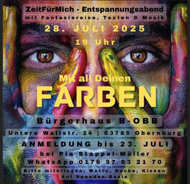 ✨ZeitFürMich – Entspannungsabend✨ 🌈Mit all Deinen Farben🌈 Gönn dir eine kleine Auszeit vom Alltag! 🌿💆‍♀️ Erlebe einen entspannenden Abend mit Fantasiereise, inspirierenden Texten und Musik – im Bürgerhaus B-OBB, Obernburg. 🧘‍♂️🎶 📅 Der Termin findet am 28. Juli 2025 um 19 Uhr statt 💛 Auf Spendenbasis 🛏 Bitte mitbringen: Matte, Decke, Kissen 📲 Anmeldung per WhatsApp: 0176 97 63 21 70