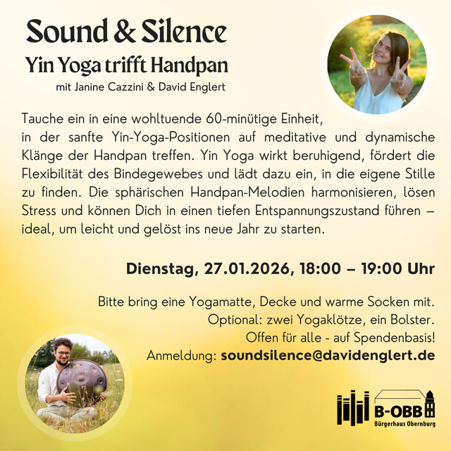 „Sound & Silence – Yin Yoga trifft Handpan“ Mit Janine Cazzini und David Englert Tauche ein in eine wohltuende 60-minütige Einheit, in der sanfte Yin-Yoga-Positionen auf meditative und dynamische Klänge der Handpan treffen. Yin Yoga wirkt beruhigend, fördert die Flexibilität des Bindegewebes und lädt dazu ein, in die eigene Stille zu finden. Die sphärischen Handpan-Melodien harmonisieren, lösen Stress und können dich in einen tiefen Entspannungszustand führen – ideal, um leicht und gelöst ins...