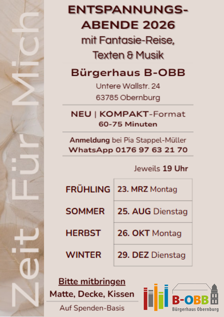 ✨ Entspannen. Loslassen. Auftanken. ✨ Die Entspannungsabende 2026 im Bürgerhaus B-OBB laden dich ein zu Fantasiereisen, Texten & Musik – in ruhiger Atmosphäre und neuem Kompakt-Format. 🕖 jeweils 19 Uhr | ⏳ 60–75 Min 🧘 Bitte Matte, Decke & Kissen mitbringen 💛 Auf Spendenbasis #ZeitFürMich #Entspannungsabend #BürgerhausObernburg #Achtsamkeit #Auszeit #Fantasiereise