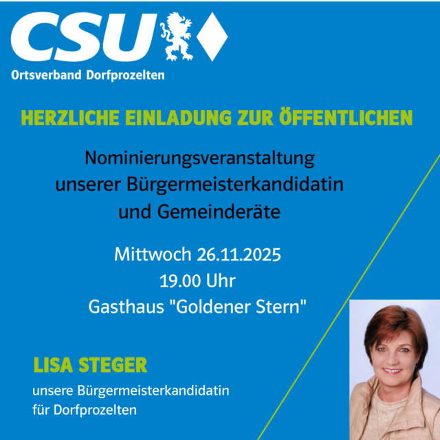 Am Mittwoch, den 26.11.2025 ab 19:00 Uhr findet die Nominierungsveranstalltung des CSU-Ortsverbands Dorfprozelten (für die Bürgermeisterkandidatin Lisa Steger sowie die Gemeinderats-Kandidaten) für die im März nächsten Jahres anstehende Kommunal-Wahlen in Dorfprozelten statt. Hierzu lädt der CSU-Ortsverband Dorfprozelten gerne seine Mitglieder sowie die interessierte Bevölkerung ins Gasthaus Stern in Dorfprozelten ein.