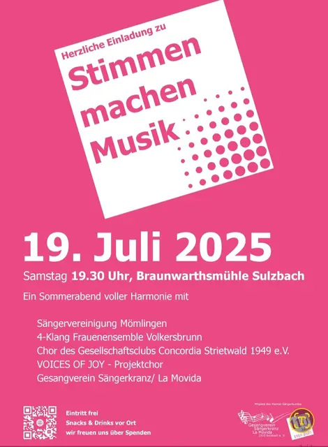 Der Gesangverein Sängerkranz 1910 Sulzbach e.V. mit seinem Chor La Movida hatte im Januar 2025 ein neues Projekt gestartet: Voices of Joy. Dass Singen Freude bereiten kann, ist ja hierzulande bekannt und das will der Projektchor am 19.07.2025 mit seinem Auftritt zeigen. Eingeladene Gastchöre und der Stammchor Sängerkranz/ La Movida werden auch auftreten. Freuen Sie sich auf feinsten Chorgesang an einem lauen Sommerabend in der Braunwarthsmühle Sulzbach ab 19 Uhr. Der Eintritt ist frei, für...
