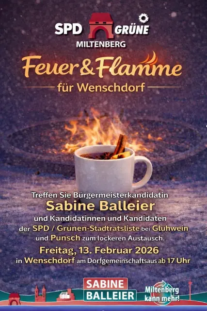 Unter dem Motto „Feuer & Flamme für Wenschdorf“ kommen Bürgermeisterkandidatin Sabine Balleier und die Kandidierenden der SPD/Grünen-Liste für den Miltenberger Stadtrat am Freitag, 13. Februar, nach Wenschdorf. Von 17 bis 19 Uhr gibt es vor dem Dorfgemeinschaftshaus Glühwein, Punsch und gute Gespräche. In entspannter Atmosphäre besteht die Möglichkeit, die Bürgermeister-Kandidatin und Kandidierende auf der Liste kennenzulernen und sich auszutauschen.