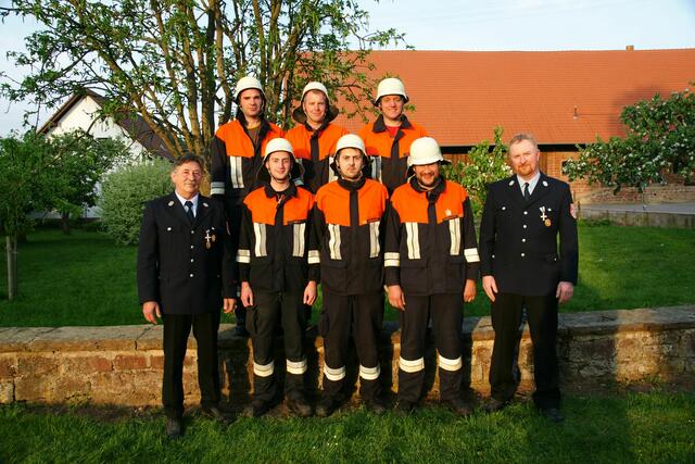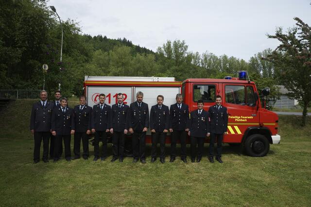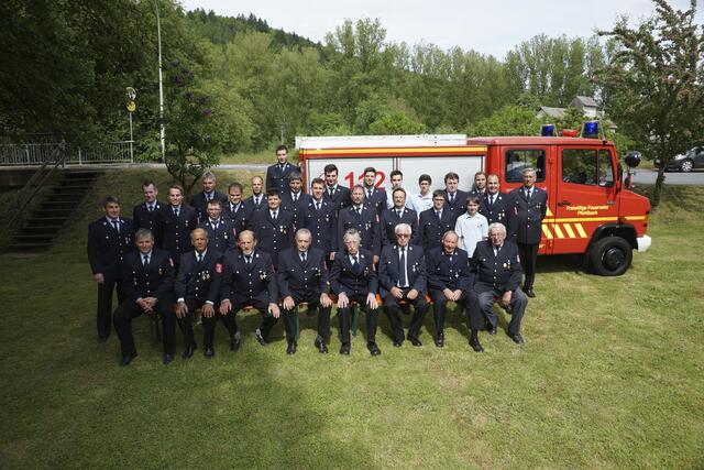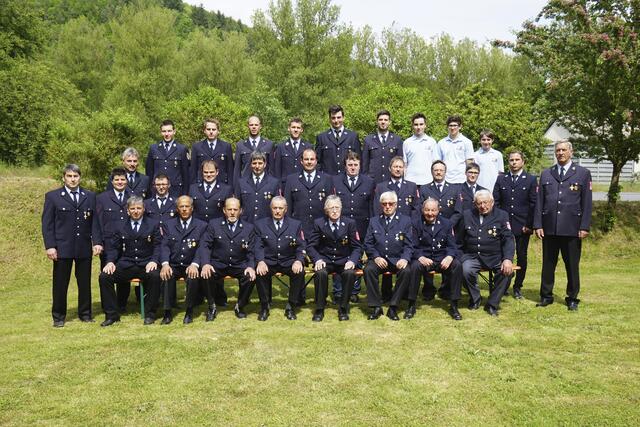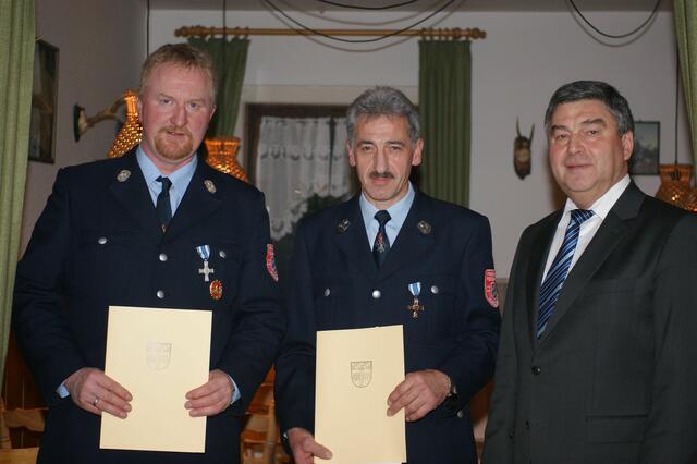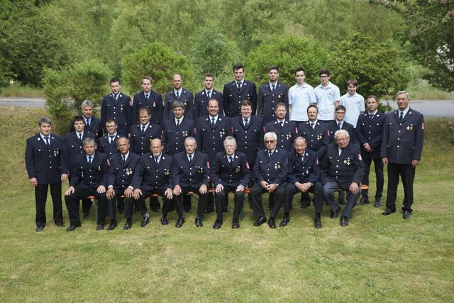 Sie erhielten das staatliche Ehrenzeichen in Gold für 40 und 50 Jahre. Mit auf dem Foto sind außerdem KBR Spilger (dritte Reihe, erster von links), KBI Klug (zweite Reihe, zweiter von rechts) und KBI Muders (zweite Reihe, erster von links), der Vorsitzende
