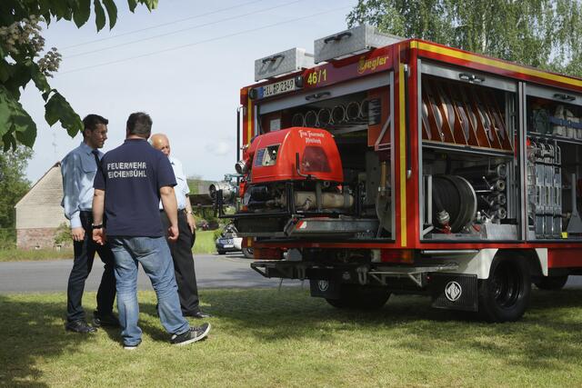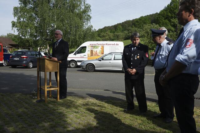 Eine Urkunde des Landkreises anlässlich des 125-jährigen Bestehens der Feuerwehr Preunschen überreichte Landrat Jens Marco Scherf (zweiter von links) im Beisein von Kreisbrandinspektor Hauke Muders (links) an Kommandant Josef Ruppert (zweiter von rechts) und den Vorsitzenden des Feuerwehrvereins, Wolfgang Böhle. | Foto: Winfried Zang