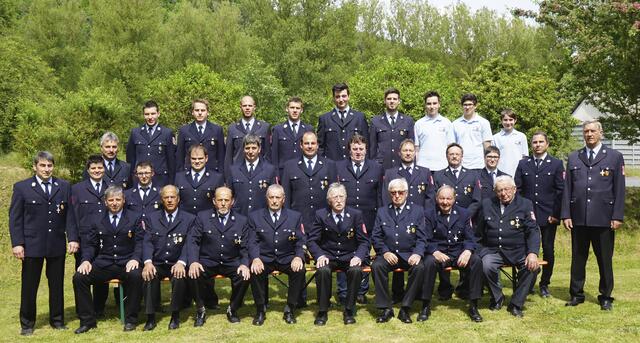 Die für 25-jährigen aktiven Feuerwehrdienst Geehrten stellten sich mit Kreisbrandrat Martin Spilger (vordere Reihe, links), Kreisbrandinspektor Patrick Walter (mittlere Reihe, links), Landrat Jens Marco Scherf (hintere Reihe, links) sowie Kreisbrandinspektor Hauke Muders (vordere Reihe, rechts) dem Fotografen.  | Foto: © Winfried Zang