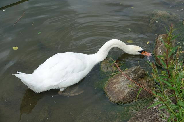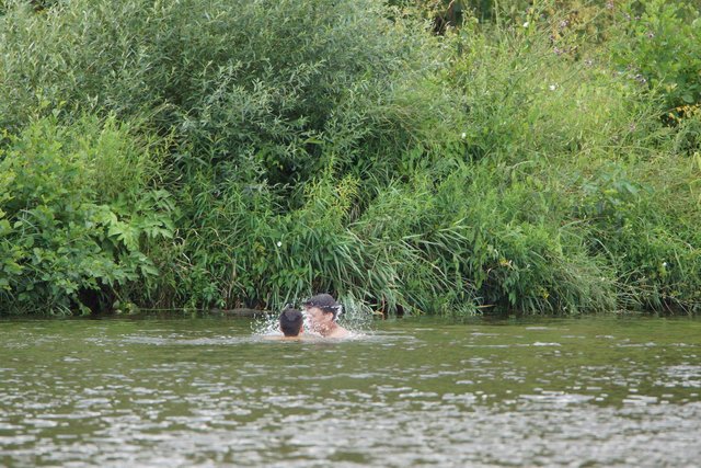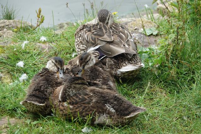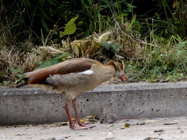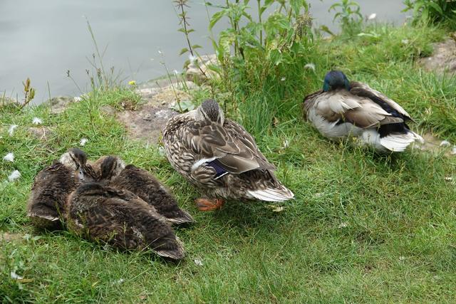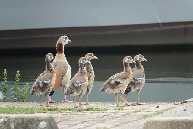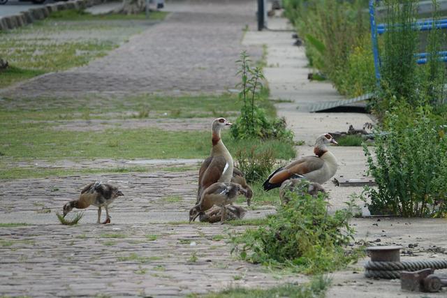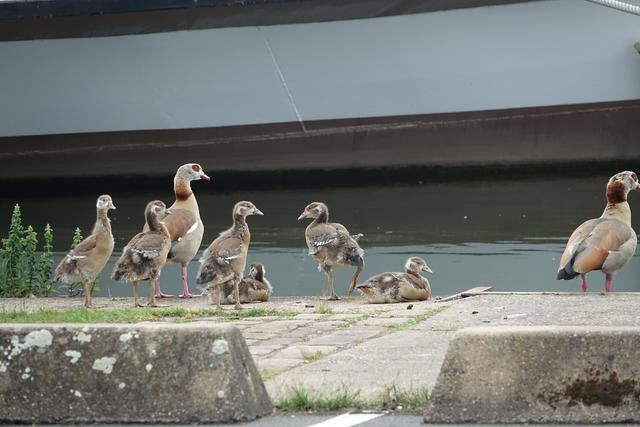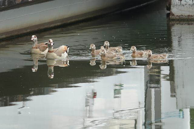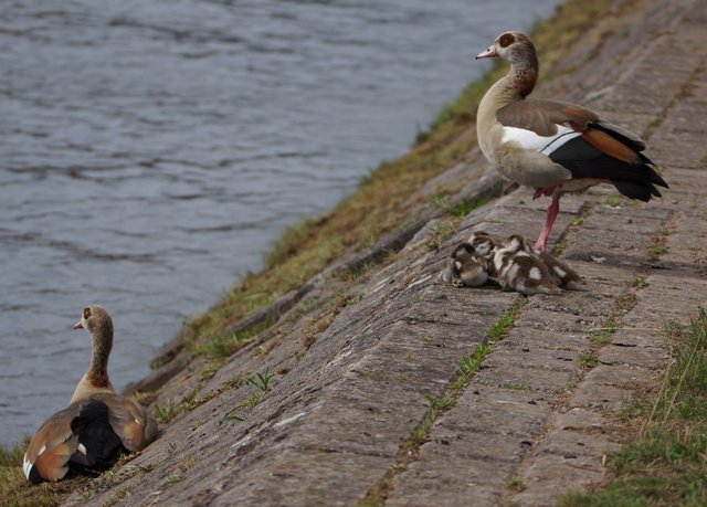 Ein Nilgänsepaar ließ sich mit ihren drei kleinen, wohl erst eine Woche alten Küken nicht davon abhalten, im Uferbereich  nach Gras und anderen angeschwermmten fressbaren Dingen Ausschau zu halten.