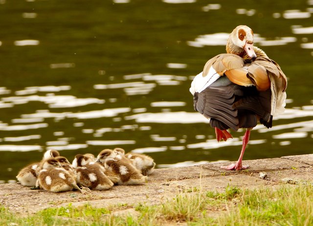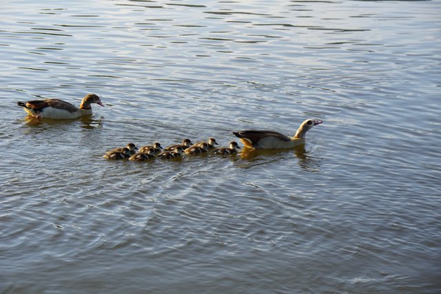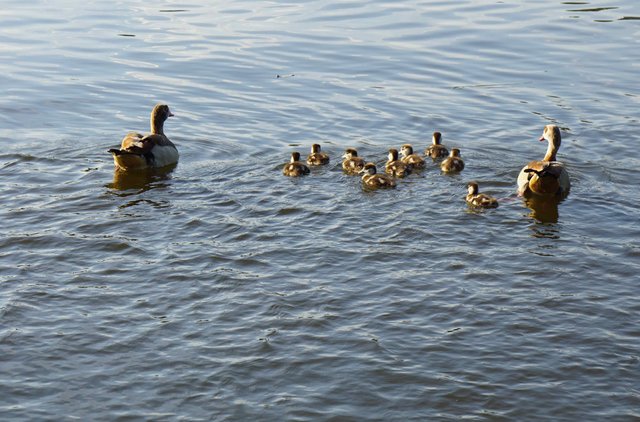 Die Mai-Nacht nähert sich. Ruhe kehrt allmählich ein und  unsere gefiederten Freunde - wie Enten und Nilgänse - sind unter sich mit ihrem Nachwuchs.