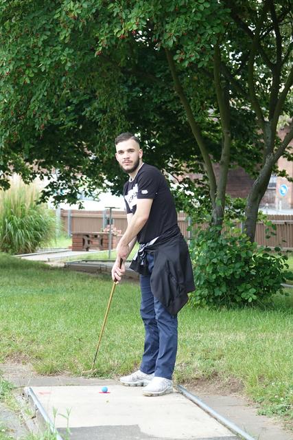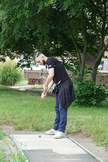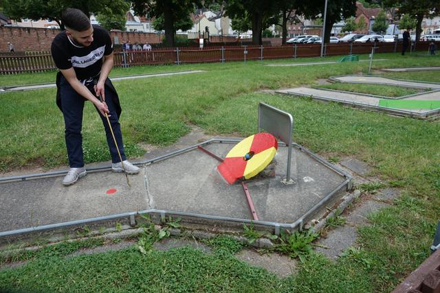 Glückstreffer! Die blaue Kugel veschwindet im Zielloch. Kompliment! - Gesehen in Miltenberg auf der Minigolfanlage.