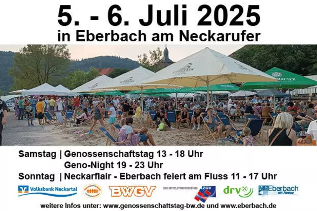 05.07.2025 | Genossenschaftstag & Geno-Night 06.07.2025 | Neckarflair – Eberbach feiert am Fluss am Neckarlauer in Eberbach Auch in diesem Jahr gibt es über zwei Tage viele Attraktionen rund um den Neckar. An beiden Tagen beste Unterhaltung mit Live-Musik auf der Neckarlauer-Bühne sowie Bewirtung und Neckarstrand. Am Samstag, 05. Juli 2025 findet von 13 bis 18 Uhr der Genossenschaftstag Baden-Württemberg statt, von 19 bis 23 Uhr heizt die Geno-Night mit der NIGHTLIVE BAND ein. In diesem Jahr...