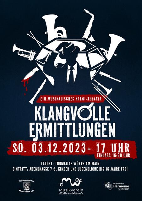 Liebe Krimibegeisterte freuen Sie sich auf einen packenden unterhaltsamen Krimiabend und rätseln Sie mit, wer hinter dem Mord stecken könnte. Erleben Sie die Musiker der drei Musikvereine, die zum ersten Mal gemeinsam im Rampenlicht des Tatorts in der Turnhalle Wörth am 3. Dezember um 17 Uhr auftreten und gleich ein zwielichtiges Geschehen aufklären müssen. Einlass ist ab 16:30 Uhr, Eintritt kostet 7 € an der Abendkasse - vorab können Tickets unter veranstaltung@musikverein-woerth.de reserviert werden.